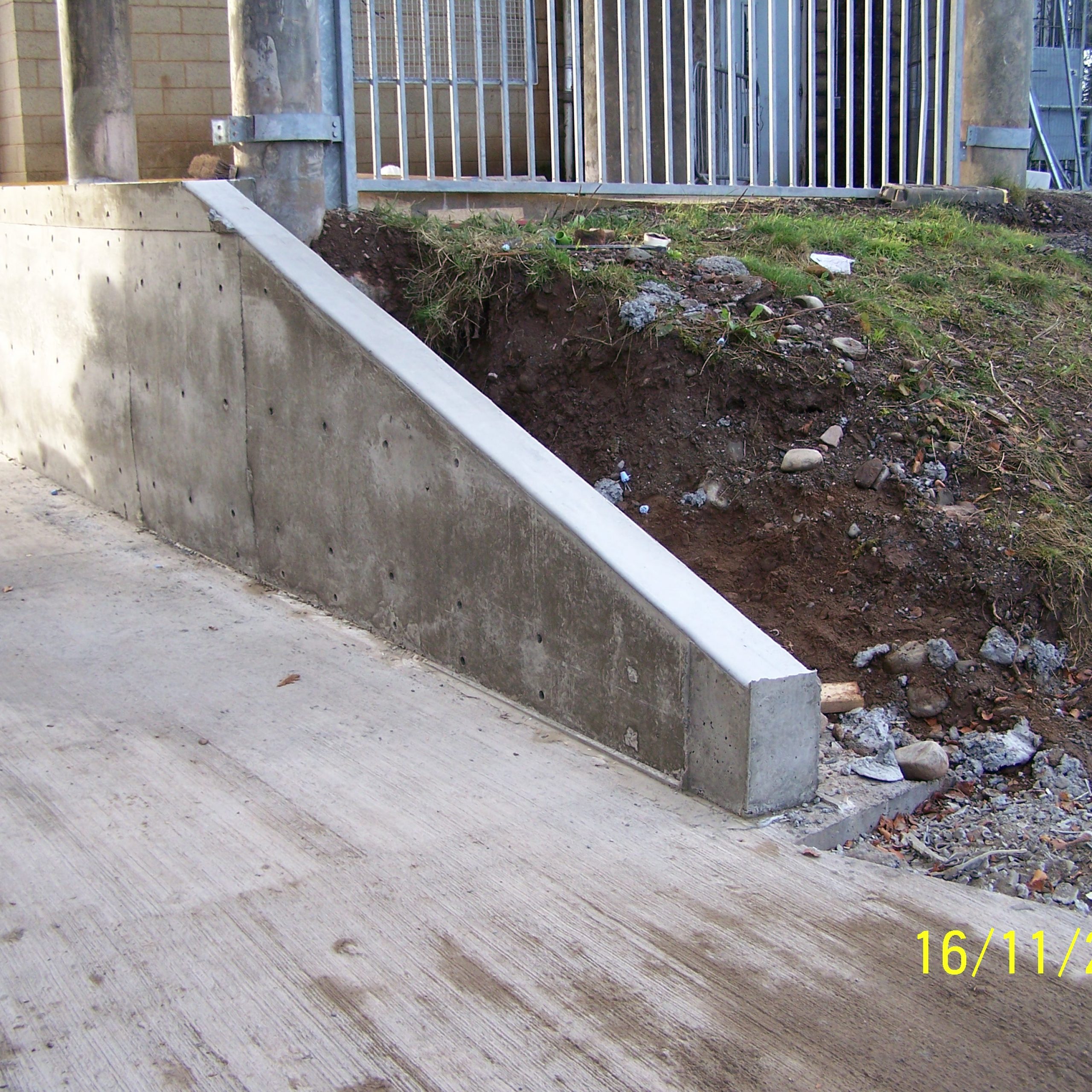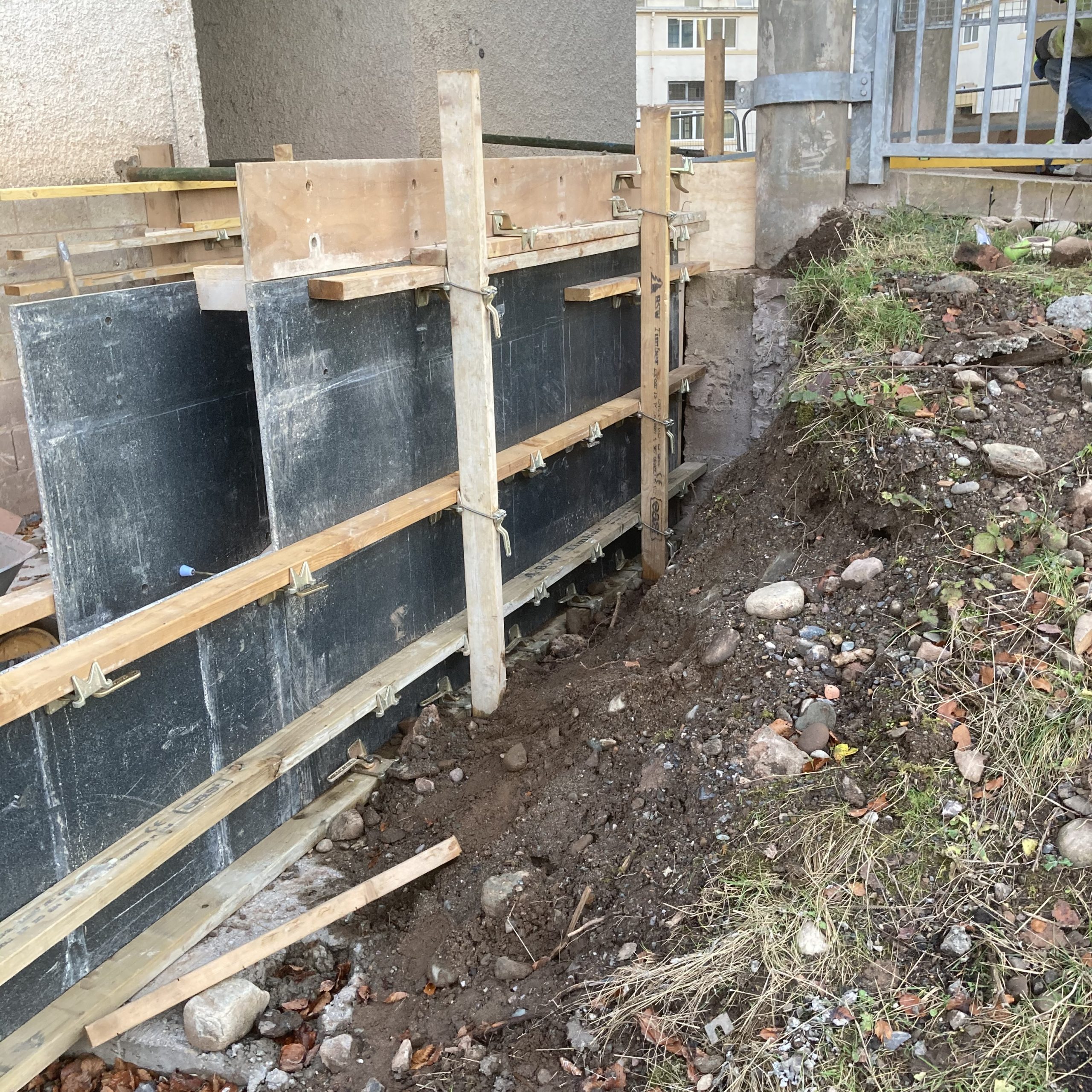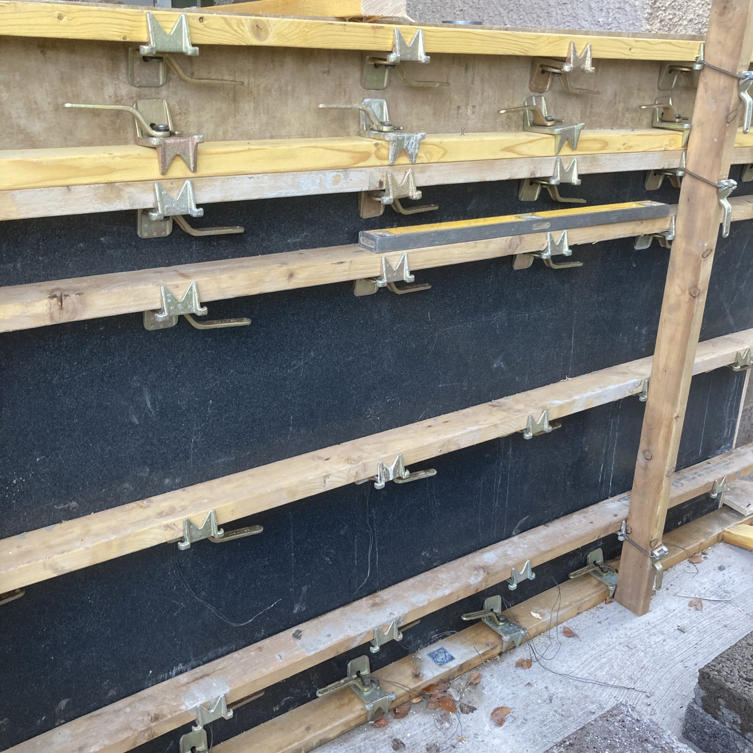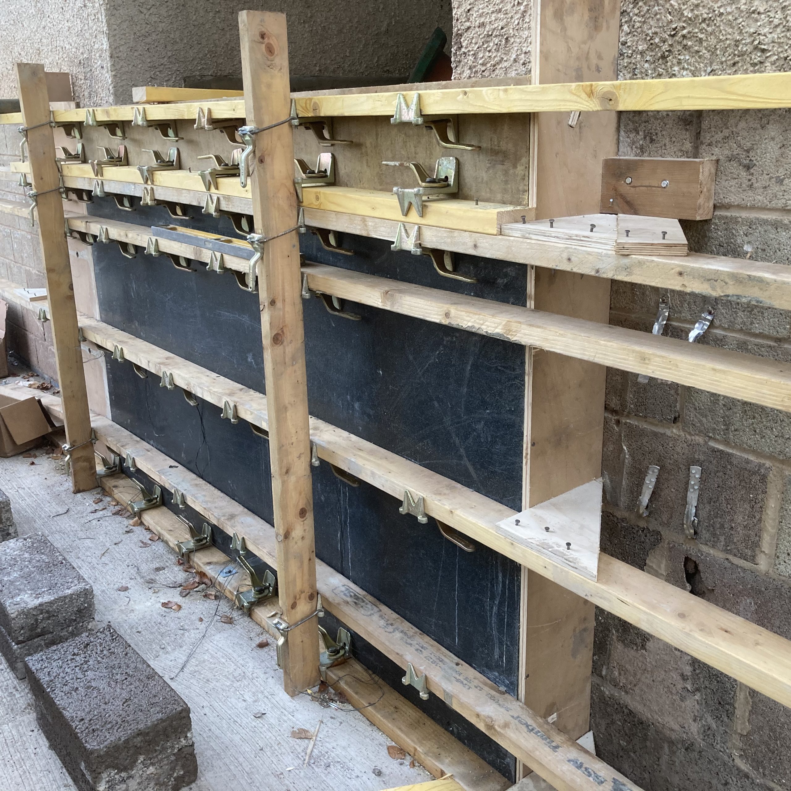 This project showed the versatility of the system. It was mainly a single sided form with a short section of standard double side with a sloped finish. Using the rebar loop ties and wire mesh for the back of the pour it was very fast and easy to set the forms. Walls were 300 and 450mm wide, and varied from 1500 – 1800mm high. Main form ply was 18mm Recycled Plastic sheets 1220×2440 with plywood strips on top to reach to pour height.