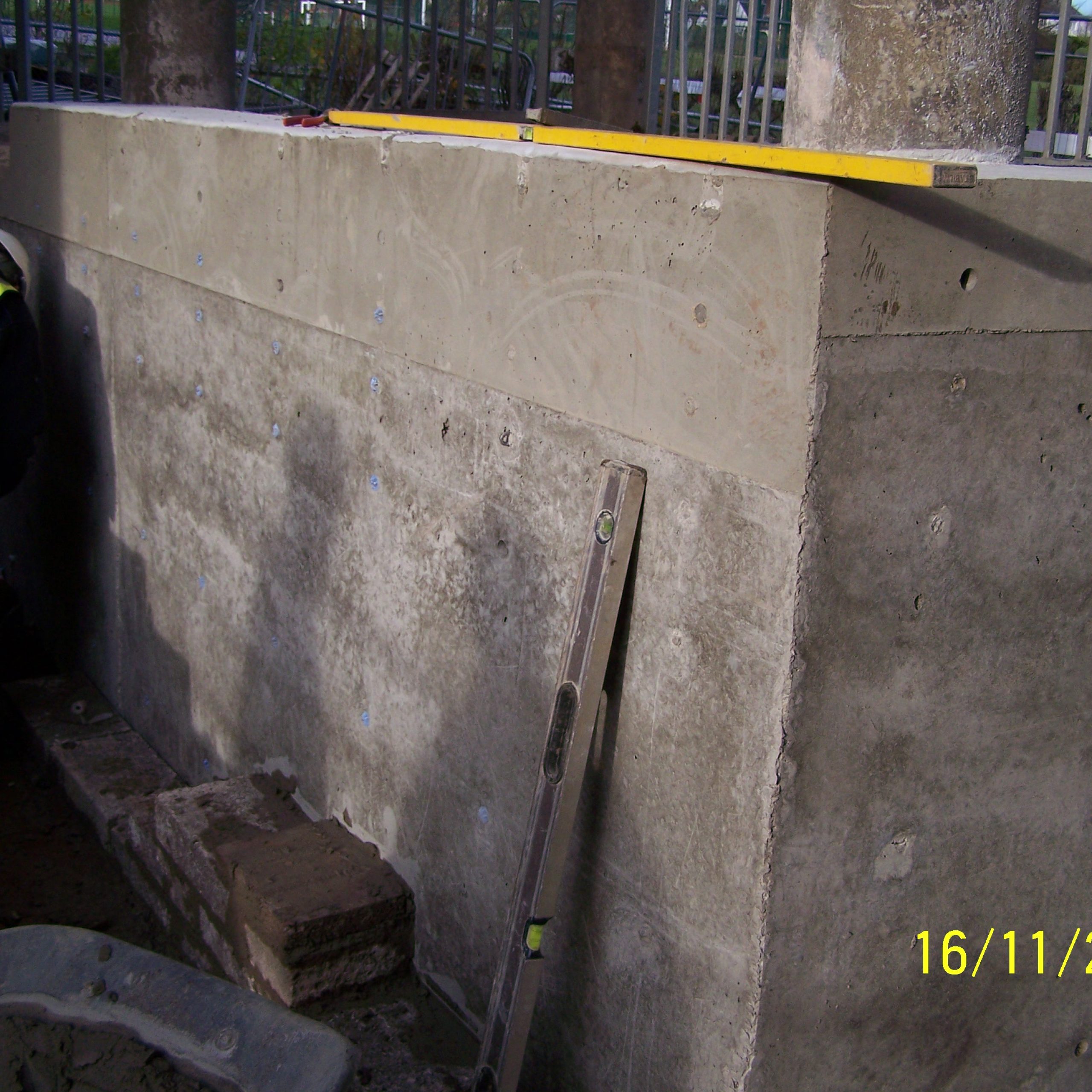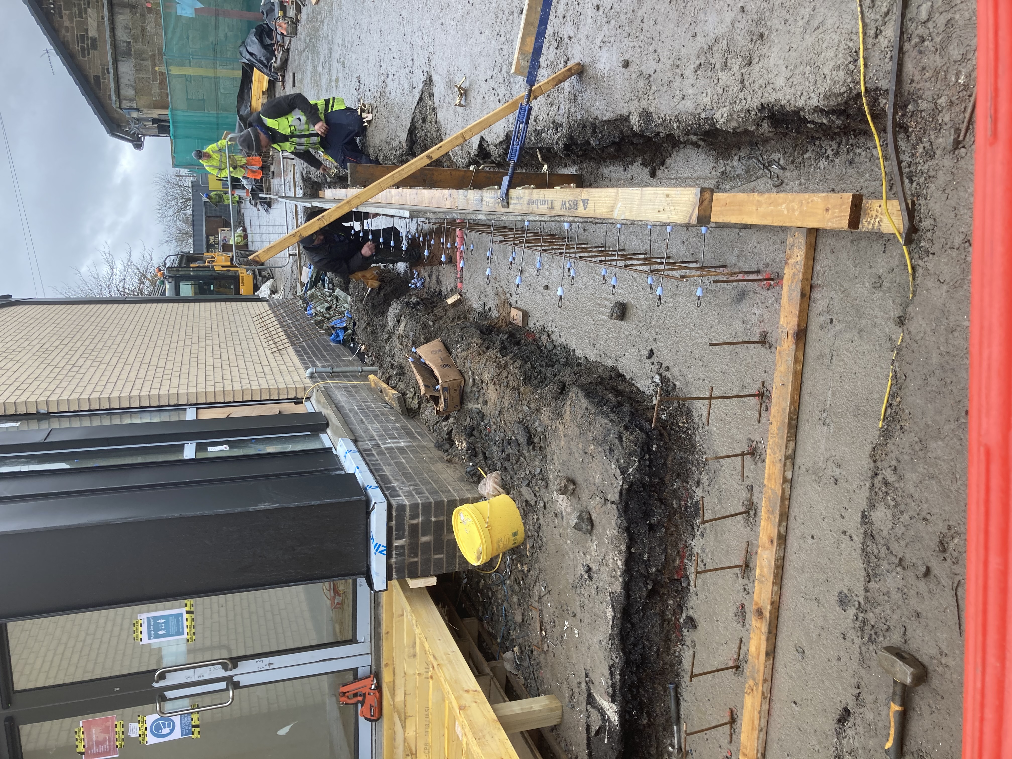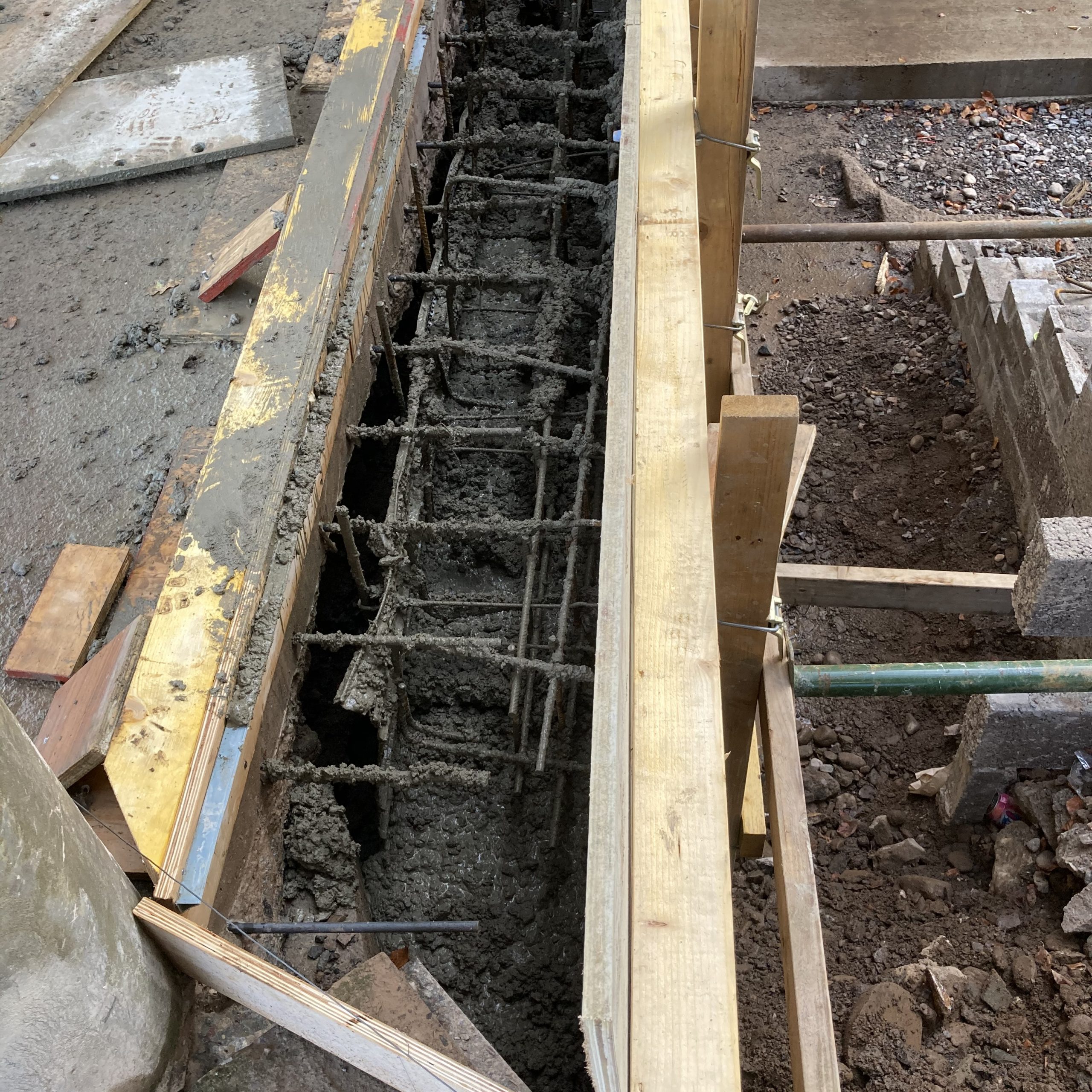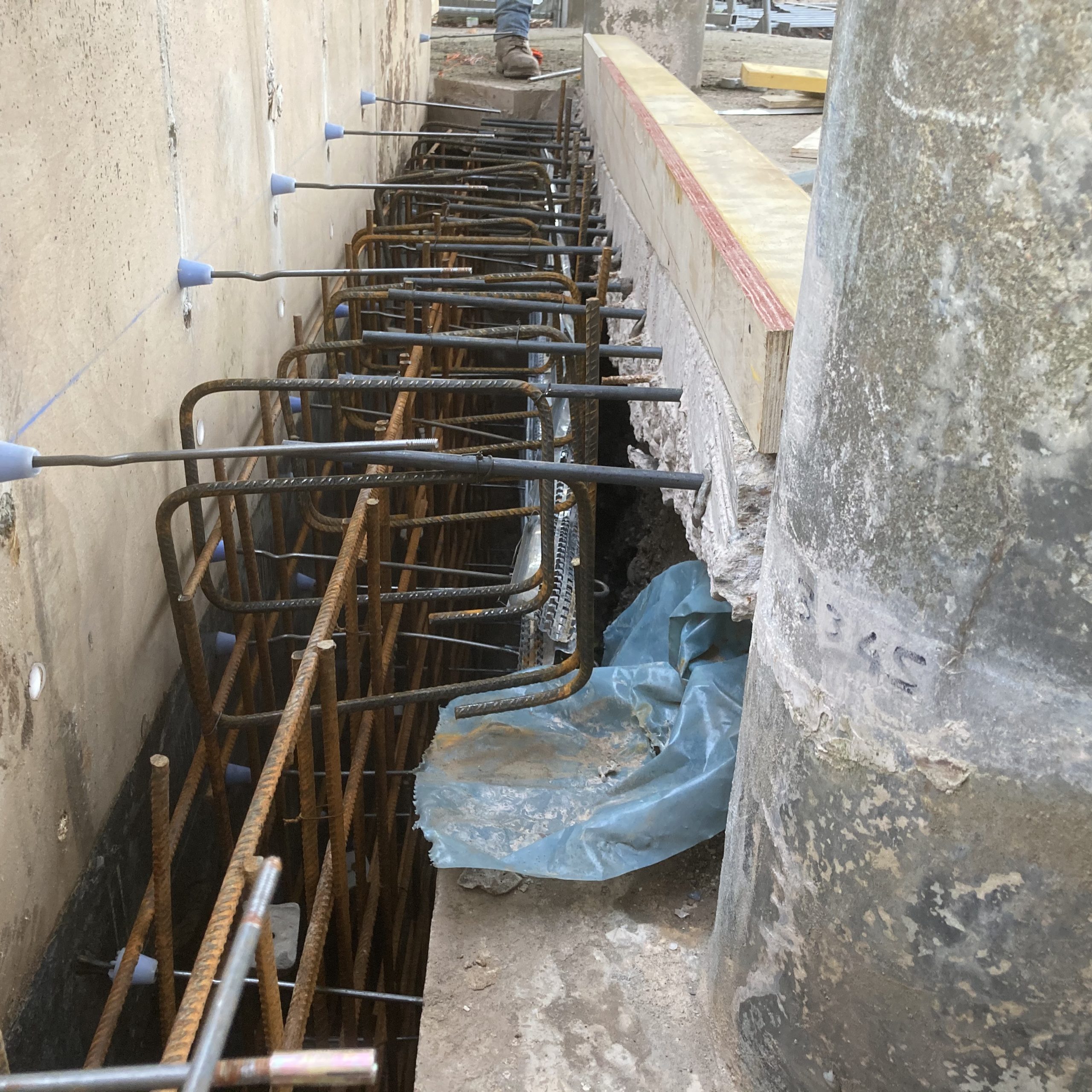 This project showed the versatility of the system. It was mainly a single sided form with a short section of standard double side with a sloped finish. Using the rebar loop ties and wire mesh for the back of the pour it was very fast and easy to set the forms. Walls were 300 and 450mm wide, and varied from 1500 – 1800mm high. Main form ply was 18mm Recycled Plastic sheets 1220×2440 with plywood strips on top to reach to pour height.