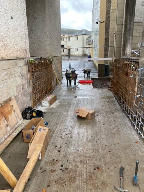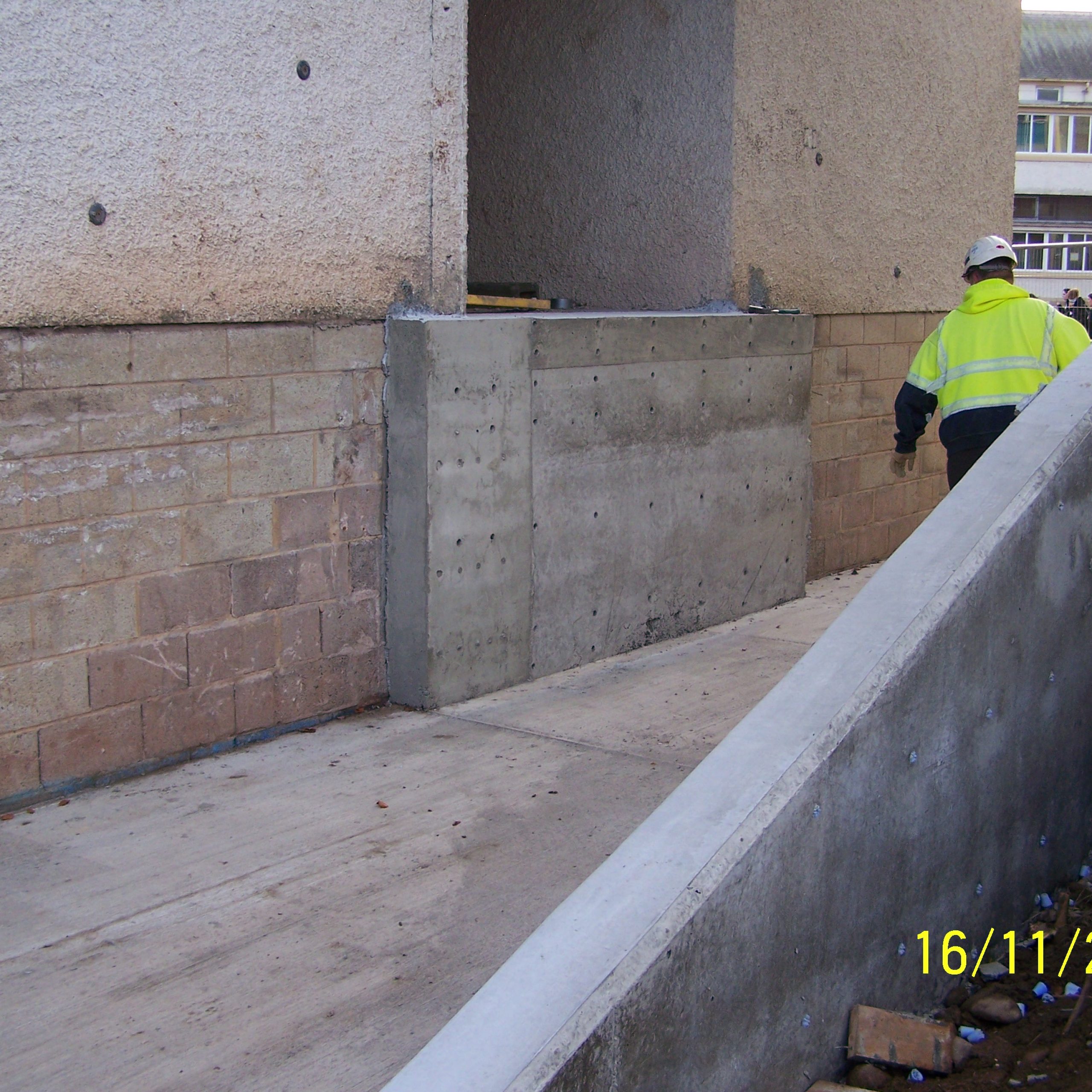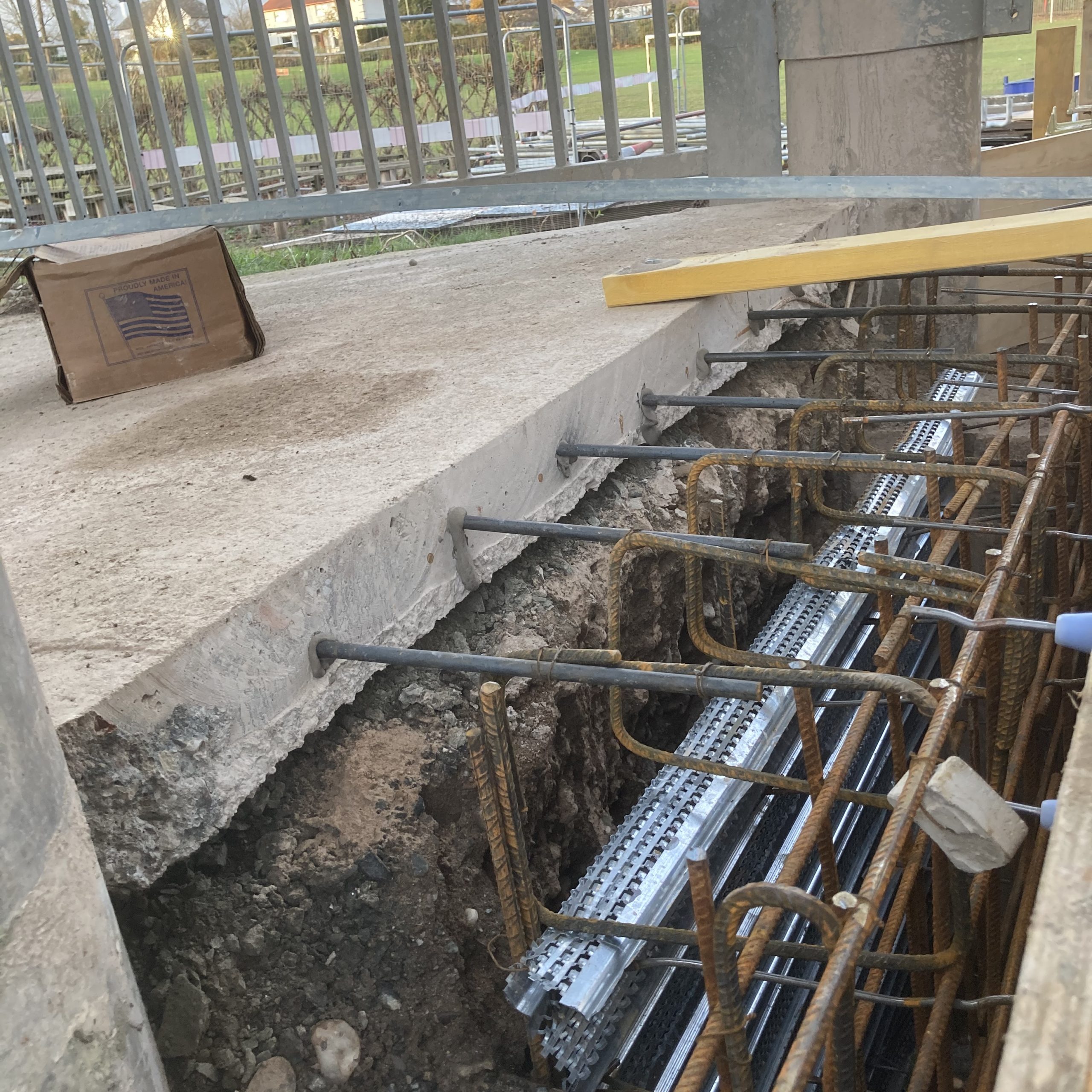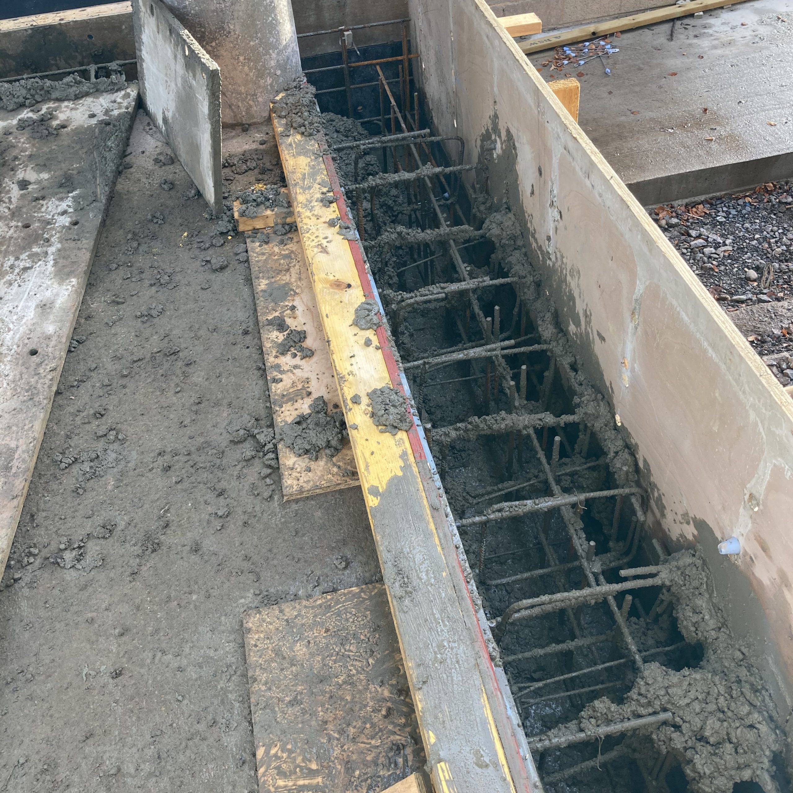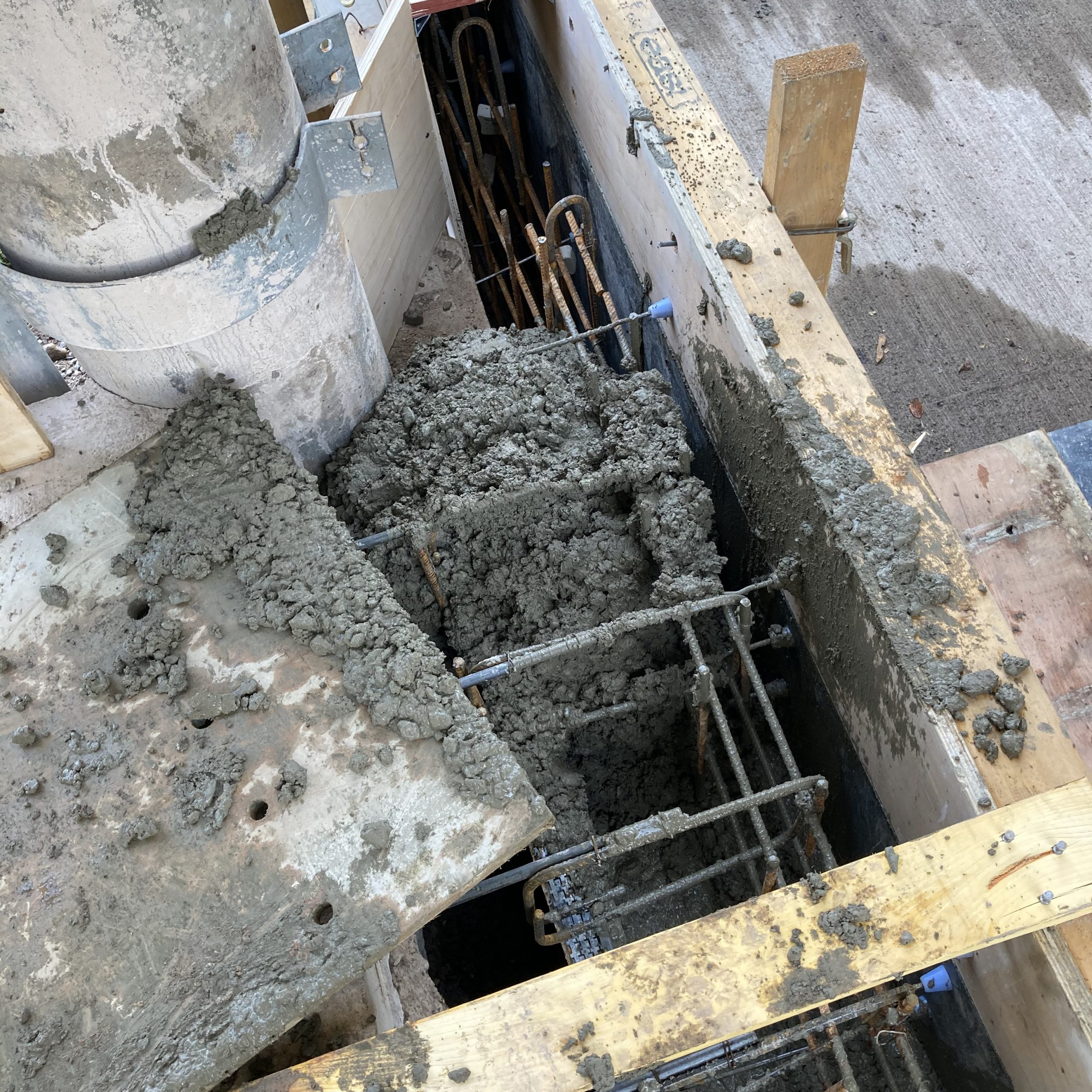 This project showed the versatility of the system. It was mainly a single sided form with a short section of standard double side with a sloped finish. Using the rebar loop ties and wire mesh for the back of the pour it was very fast and easy to set the forms. Walls were 300 and 450mm wide, and varied from 1500 – 1800mm high. Main form ply was 18mm Recycled Plastic sheets 1220×2440 with plywood strips on top to reach to pour height.